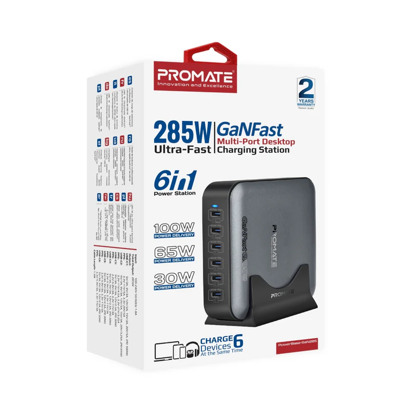 - Promate PowerBase-GaN285 285W Ultra-Fast GanFast Multi-Port Desktop Charging Station Promate PowerBase-GaN285 285W Ultra-Fast GanFast Multi-Port Desktop Charging Station