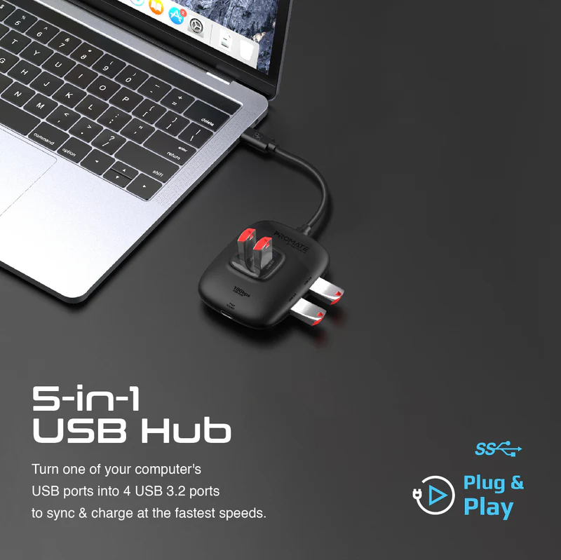 High-Speed Connectivity and Sleek Expansion: Promate SnapHub-4 4-in-1 Ultra-Fast USB 3.2 Hub - Black